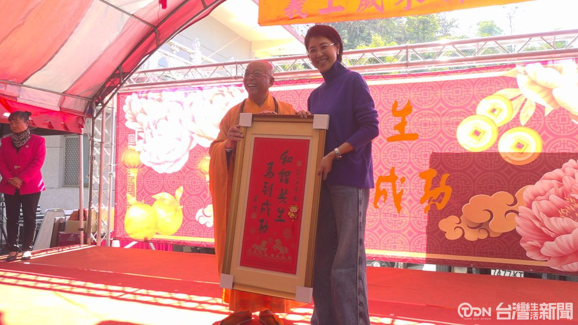 鑼鼓喧天、祥獅獻瑞,為現場帶來滿滿喜氣與祝福。清德寺住持慧龍法師致贈許縣長由星雲大師親筆書寫的墨寶「和諧共生」、「馬到成功」春聯。