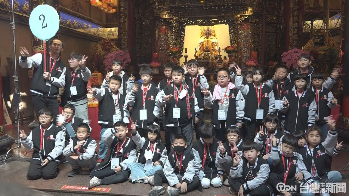 ▲參加營隊的孩童在太平媽祖前合影留念。記者 謝沂辰/攝