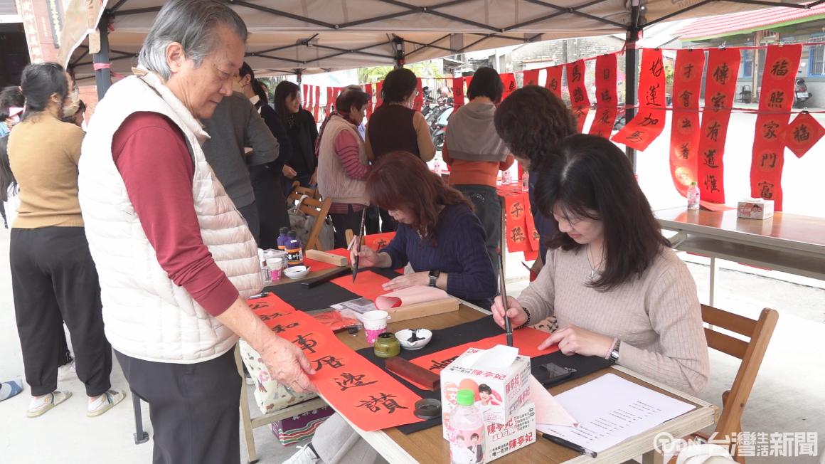 ▲臺南社區大學台江分校所成立的台江書法社,在新春時刻,發起巡迴台江廟口寫春聯送春聯活動。/記者 蘇英豪攝