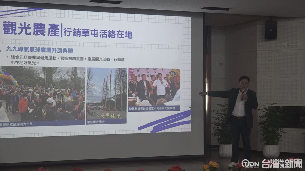 草屯鎮長簡賜勝透過簡報,報告上任一年來的施政成果。包含規劃九九峰健走等大型活動、加強觀光農產行銷,也推出兒童生日禮金,為弱勢家庭投保意外險,並改善瓶頸道路與交通設施,在文化與休閒建設上也有所進展。