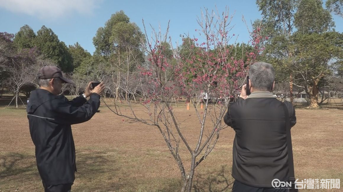 ▲少數幾棵花況理想的櫻花,成為遊客拍照對象。/記者 王昭聖 攝