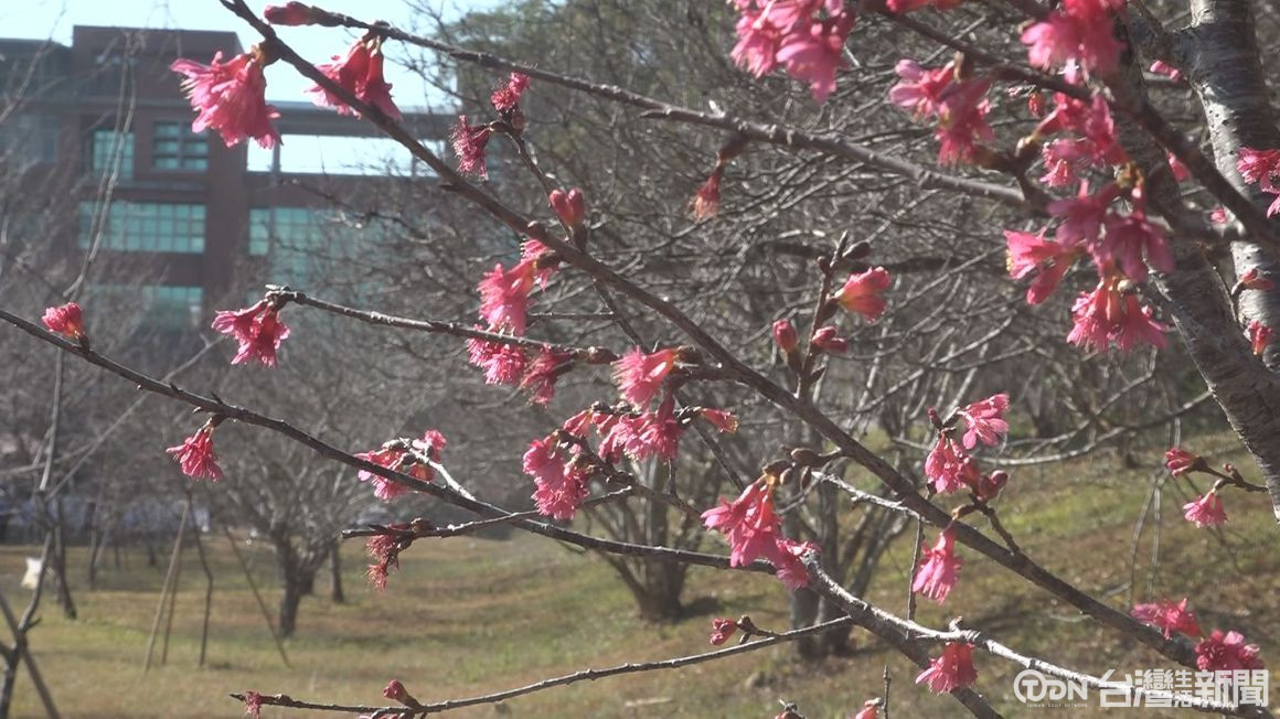 ▲暨大校園內三千株櫻花,目前花開不到一成。/記者 王昭聖 攝