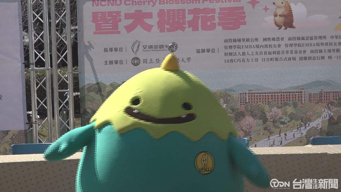 ▲埔里鎮吉祥物噗哩為暨大櫻花季開場。/記者 王昭聖 攝