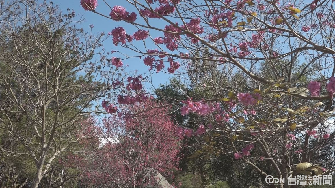 ▲校園內盛開的美人樹,與櫻花相互輝映。/記者 王昭聖 攝