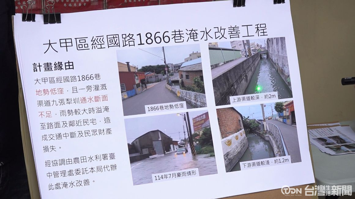 一下大雨就淹水,大甲區經國路1866巷的水患問題,困擾當地居民多年,由於地勢低窪,加上灌溉溝渠斷面狹窄,排水量早已不敷使用。