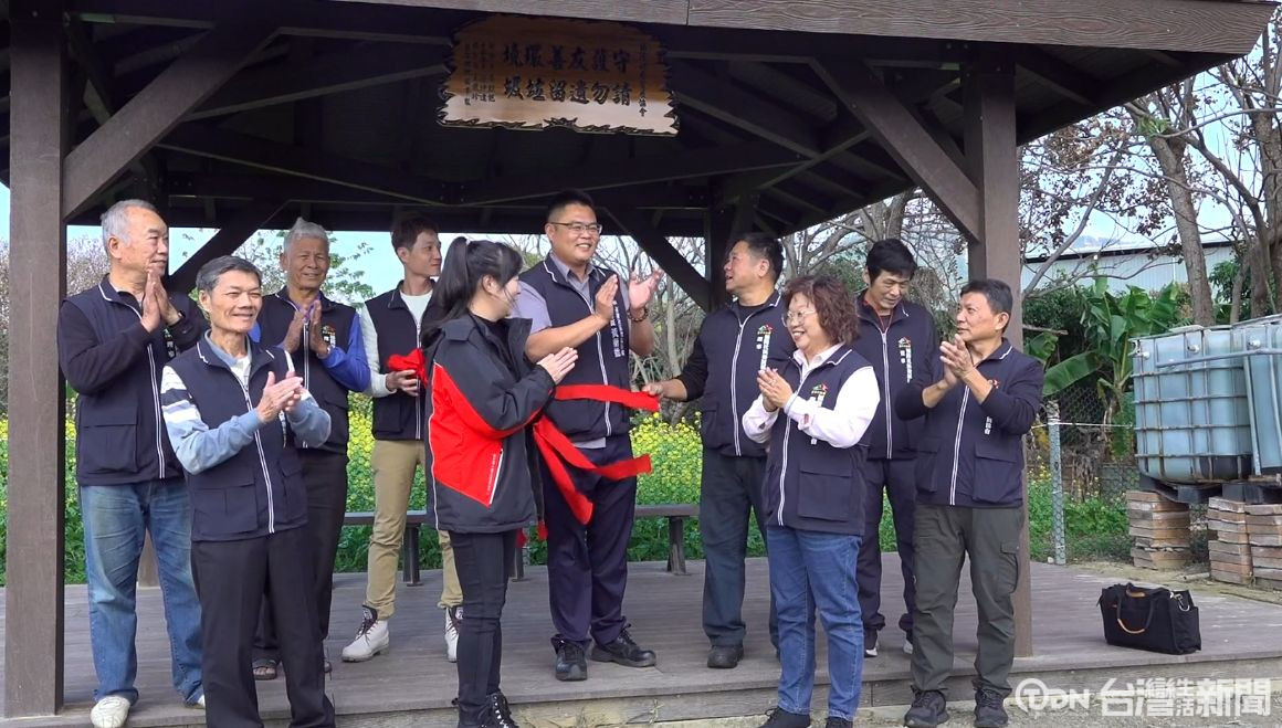 眾人揭牌,宣告身後的國有地大變身,過去這裡是雜草叢生,甚至被丟棄垃圾,成為社區髒亂點,幸好經當地里長黃楷能爭取各界協助,並向國有財產署認養土地後,才逐漸加以打造改變。