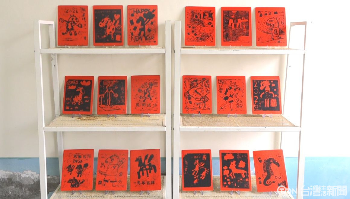 另外一旁的大秀國小展區,也特別集結全校一百多位六年級學生,設計出「天馬行空版畫展」,用童趣筆觸刻畫出奔馳的天馬,把對新年的期待,刻進每一張版畫裡。