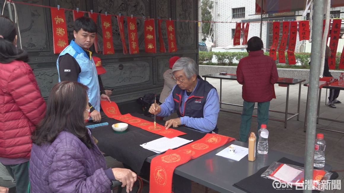 ▲剪髮之外,保全公司也邀請吳天地跟翁坤銘兩位書法老師到場揮毫寫春聯送民眾,增添年節氣氛 / 記者 王可萱 攝