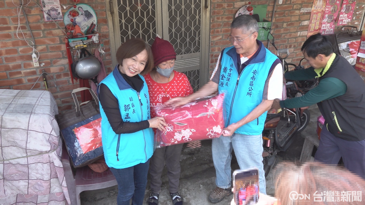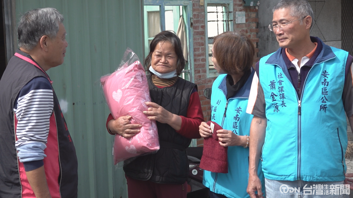 來到安南區北汕尾二路550巷,這臺載滿棉被跟一袋袋裝滿民生物資的貨車已經到位,這是要送給鹿耳社區獨居長輩的愛心,因為春節將要來到加上這幾天天氣寒冷,理事長蔡登進擔憂社區內這群邊緣戶寒冷,所以再次結合台江常民生活關懷協會、常備士官班校友會等志工出錢又出力,募集相關物資來發送,安南區副區長郭孟淑也專程到場關心,還親切替長輩戴上溫暖的毛帽,場面溫馨。
