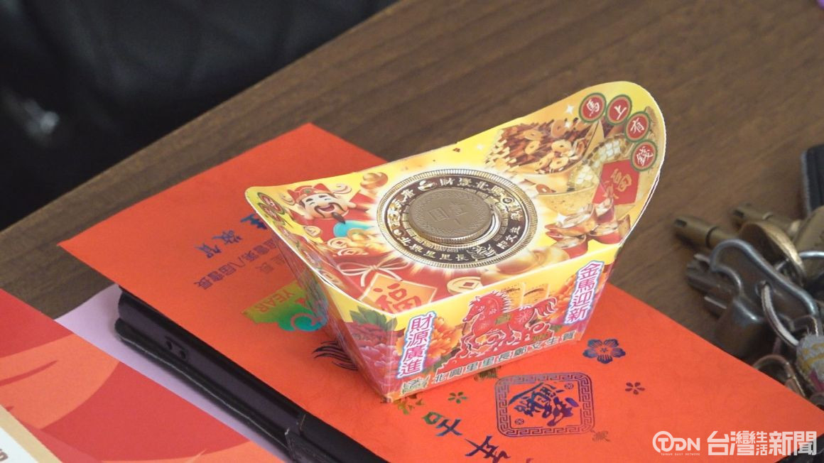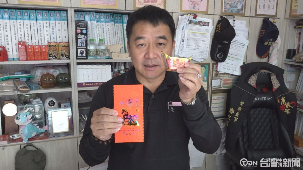 ▲臺南市永康區北興里里長鄭文生,自行印製「發財錢母」金元寶及紅包袋,提供里民免費限量索取。/記者 蕭建緯攝