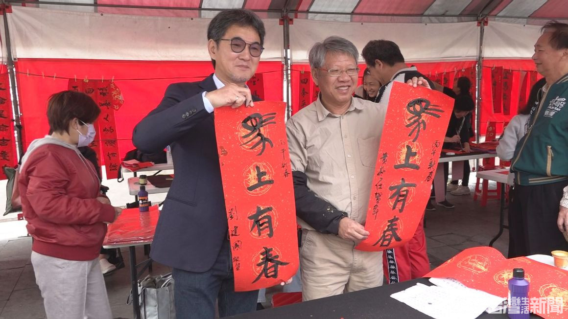 立法委員劉建國與書法大師一同寫下「馬上有春」祝福語,提早迎接新年。立委劉建國服務處31日和在地書法家及社福團體,於斗六火車站前辦理捐發票換春聯寒冬送暖活動,劉建國表示,這樣的活動已經是第17年舉辦,今年更有許多善心人士贊助約1500份物資,將送給斗六及斗南地區的弱勢家庭。