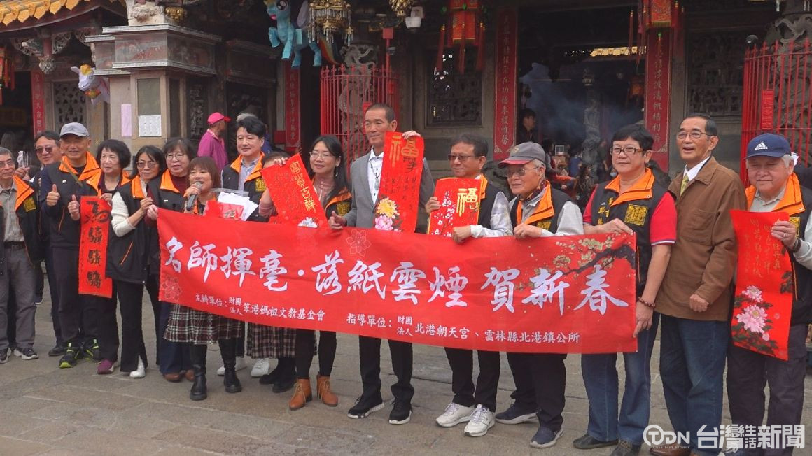 ▲笨港媽祖文教基金會連續17年,在過年前來到北港朝天宮廟前,邀請在地書畫名家現場揮毫,也讓來參拜的信眾感受過年氣氛。/記者 陳佳昇 攝。