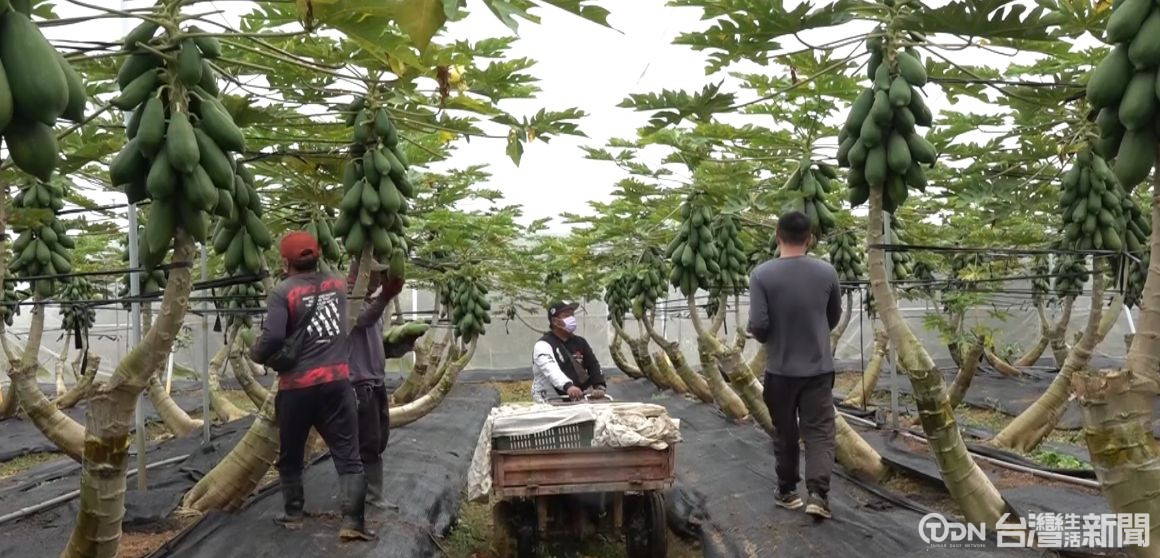 ▲農民觀察木瓜生長狀況,天氣愈熱愈有利木瓜害蟲-葉蟎的生長/記者 張瑋玲攝