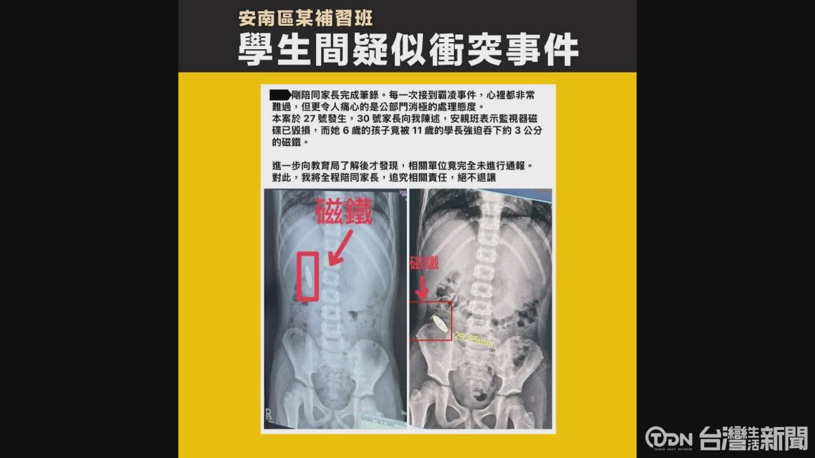 臺南市安南區一間補習班爆出學童遭霸凌,小五學生疑似逼小一學生吞下大約3公分的磁鐵,而疑似施暴的小五學生的家長就是該補習班的教師。這案係由學校導師在1月29日上午接獲疑似被行為人家長訊息,導師覺察有異,校方知道屬校外生生衝突事件後,在30日完成校安及社政通報,通報時間符合24小時期限之規定。