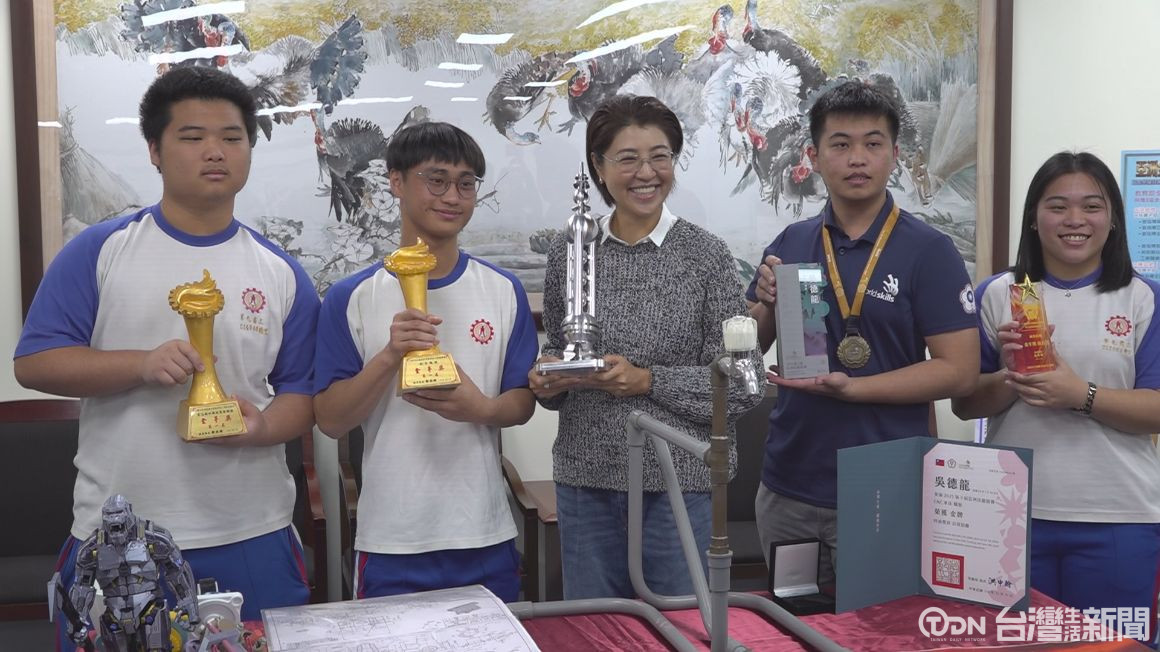 獲獎學生把作品搬進縣長室,分享訓練及參賽過程。這是草屯商工師生團隊在技藝競賽中表現亮眼,接連拿下國內外三面金牌。
