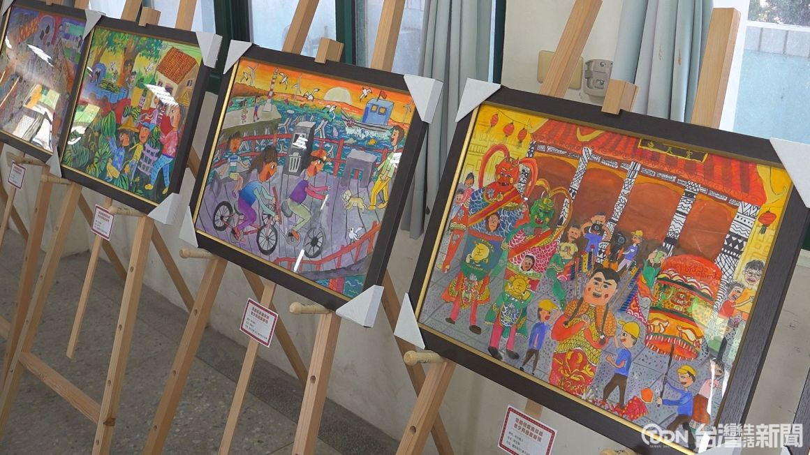 ▲一幅幅趣味的兒童創作跟社區大學傳統水墨畫一起展覽,不只是讓大家看到沿海人文風情,也展現老幼共學精神。/ 記者 陳佳昇 攝。