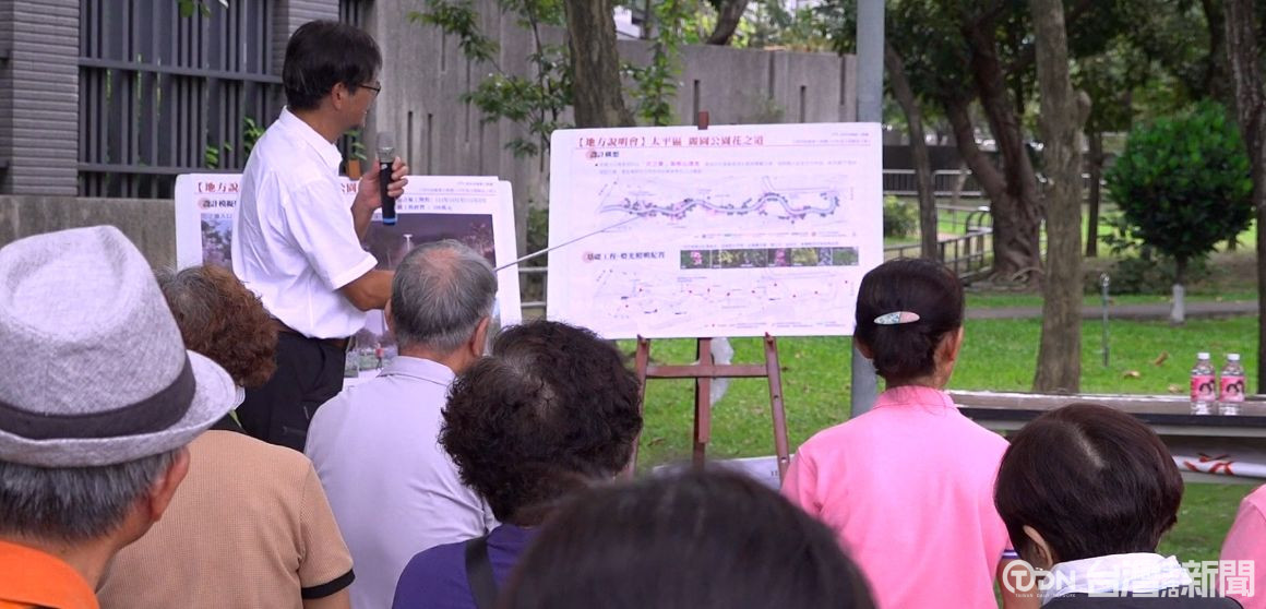 相關人員向地方說明花之道的工程設計規劃,位在太平光華里的麗園公園,是不少民眾散步休憩的好去處,為了讓公園更加友善共融,台中市議員爭取經費,要在公園內打造花之道,成為太平區的新亮點。