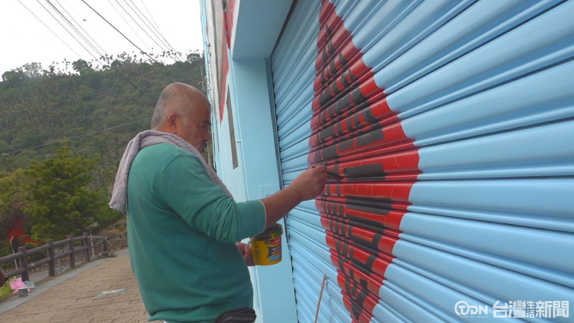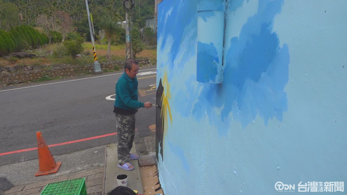 除了理事長,另外一邊還有一位畫家,虎尾知名壁畫「屋頂上的貓」的作者-田榮鈐,受社區邀請也前來參與創作,畫華山從早到晚的各種美景。