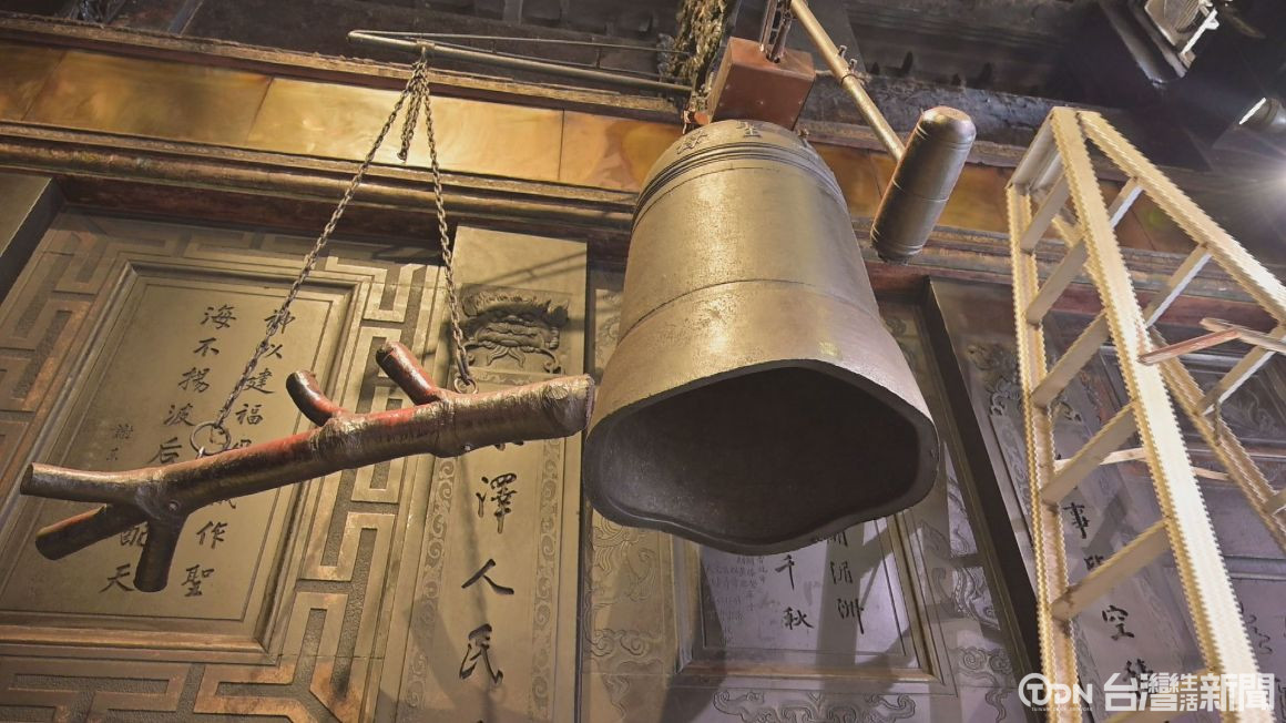 ▲北港朝天宮於清掃大殿這天,會將銅鐘內「蓋運」的紅紙清除,也象徵新的一年即將來到。/記者 陳佳昇 攝。