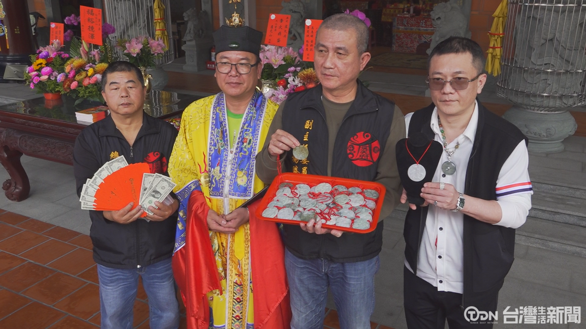 ▲斗六市震天府配合新春推出祈福活動,今年只要到廟裡點光明燈、藥師燈、智慧燈或財神燈,即可獲贈一枚市價約3千元開光加持的圓形翡翠福牌,限量3888面。/記者 江儀 攝