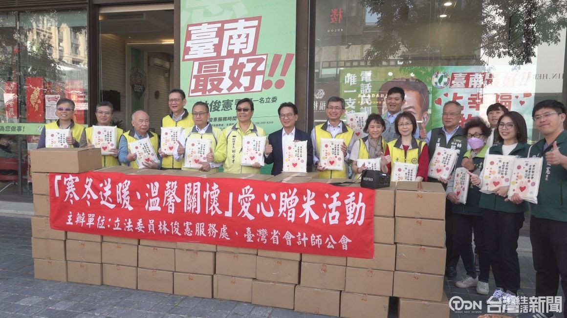 ▲臺灣省會計師公會跟立委林俊憲以及多位市議員捐贈白米,給社福團體跟有提供助餐的社區。/記者 蘇英豪攝