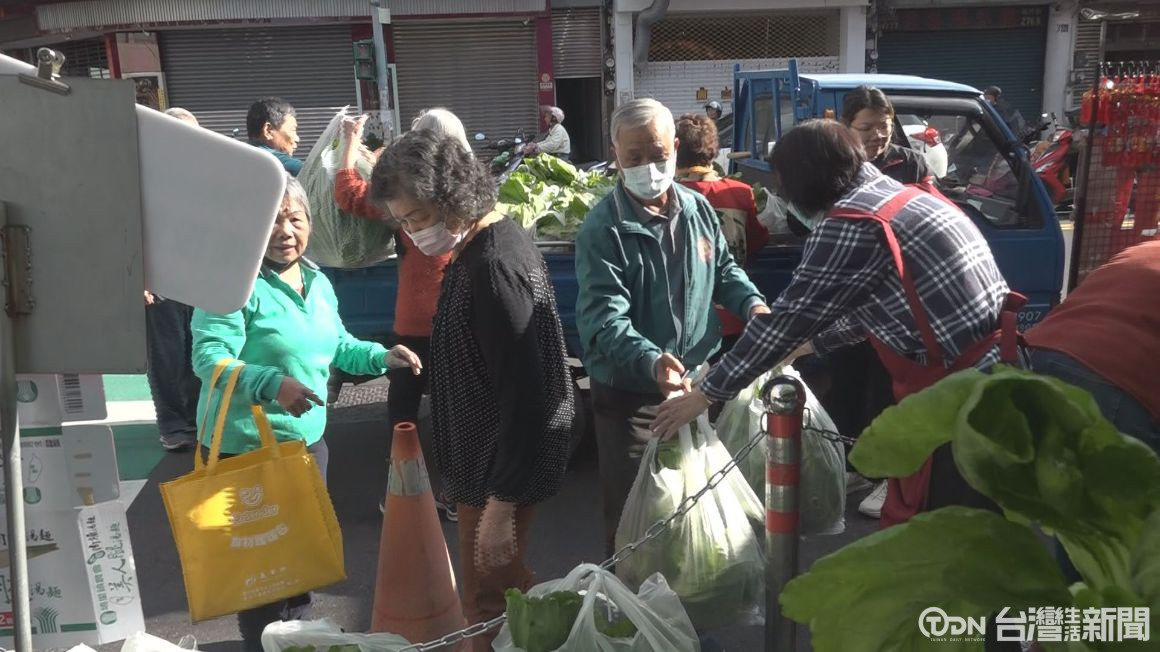 綠照班長輩們,當起菜販,在農會門口認真賣菜,這些自己種的刈菜,大又漂亮,重點是價格非常便宜,吸引不少民眾前來購買。