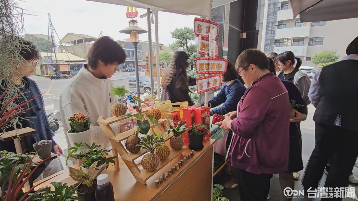 市集現場有小農帶來自己栽種的小番茄、青菜、水果、黑豆及手工蛋糕等農特產品展售;另外,南大附中園藝系的學生與老師,也展示並販售自行培育的鹿角蕨,以及適合春節應景的喜氣小盆栽,吸引許多民眾挑選與購買。