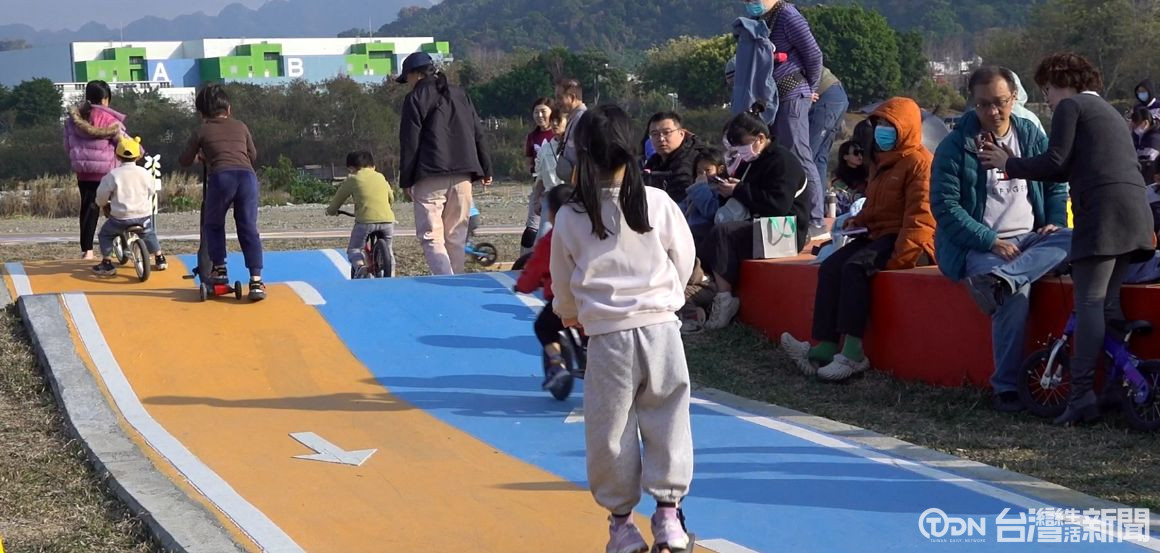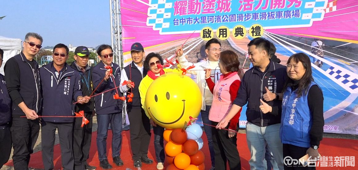 這在大里區草湖溪高灘地的滑步車、滑板車廣場,占地3公頃多,在市議員林碧秀爭取下,水利局斥資550萬元所打造,場域鋪面以繽紛活潑的色彩設計,營造安全又具吸引力的遊戲環境,同時融入紅綠燈、道路標線等交通號誌元素,讓孩童在遊戲過程中自然建立交通安全觀念,寓教於樂,這天也正式啟用。