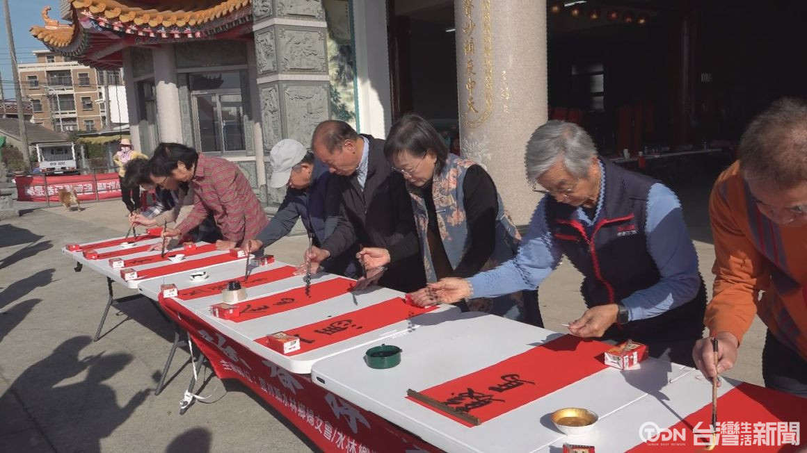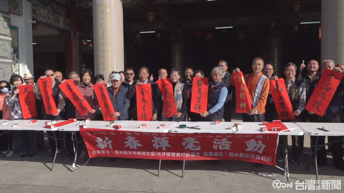 書法老師一字排開寫春聯開場,水林鄉婦女會為增添過年氣氛、推廣書法藝術,結合廟宇文化,來到灣東村碧清寺辦理新春揮毫活動,由縣議員黃文祥一次邀來蔡誠賢、黃鎮雄、吳天地等等7位縣內知名的書法老師,現場熱鬧滾滾。