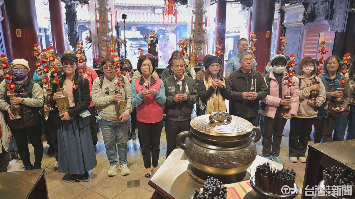 ▲為感謝北港媽祖庇佑,台灣工藝之家纏花工藝師林佩瑩連續11年,帶領雲林縣纏花藝術協會學員等人,向北港朝天宮眾神獻上新年纏花。/記者 陳佳昇 攝。