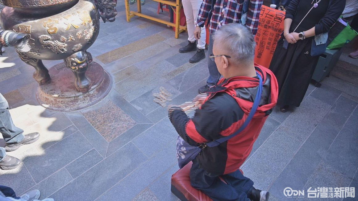 ▲廟內舊的纏花提供給民眾擲筊帶回家,除了能將香火加持的纏花收藏以外,也祝福民眾新的一年平安順利。/記者 陳佳昇 攝。