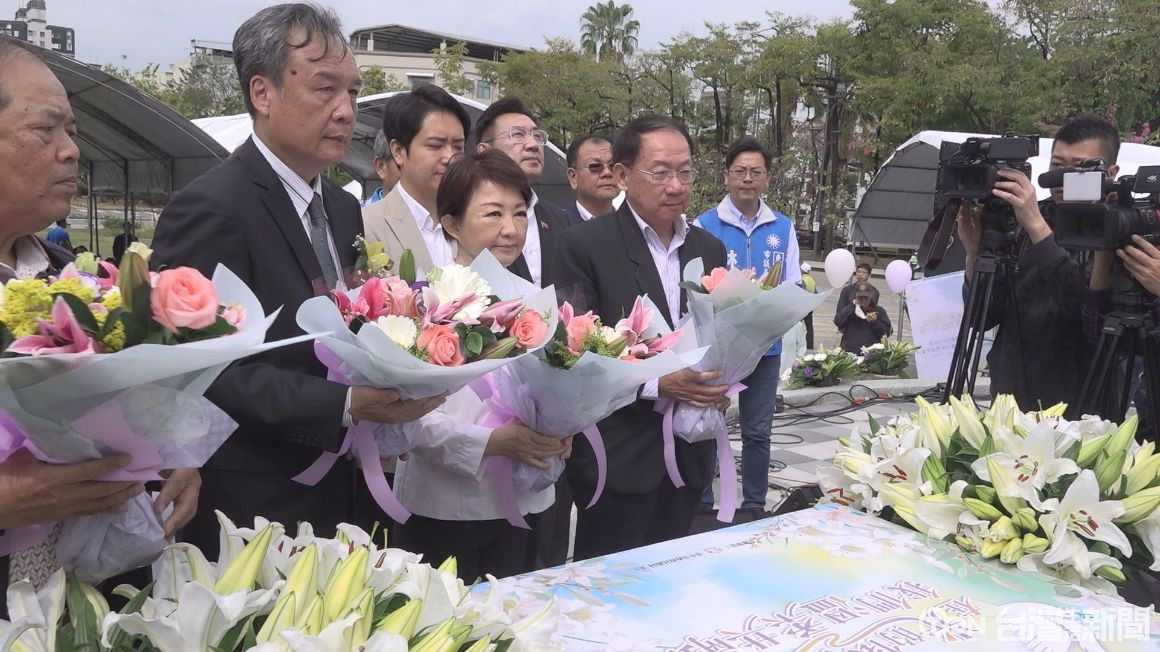 ▲鮮花百合致意,台中市長盧秀燕率團追思228事件/記者 李晉仰攝