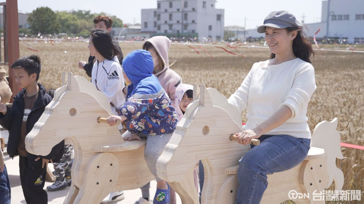 ▲現場裝置麥田溜滑梯和麥田搖搖馬,大小朋友都玩得不亦樂乎/記者 李晉仰攝
