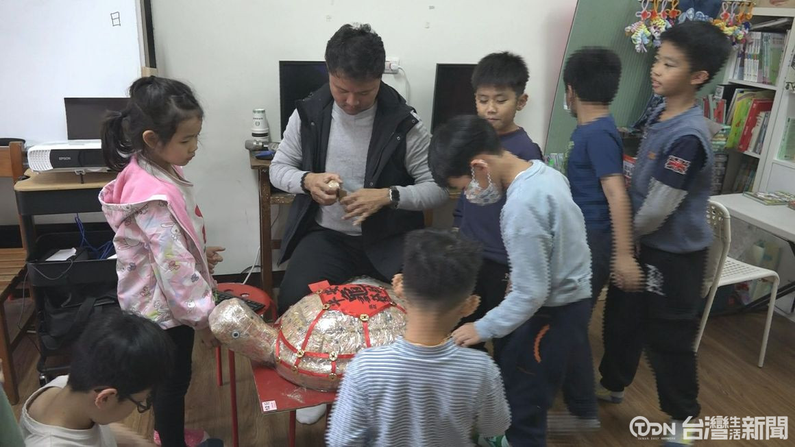 ▲王信傑也分享他在當日擲茭到的平安龜,讓小朋友帶回去當點心。記者 謝沂辰/攝