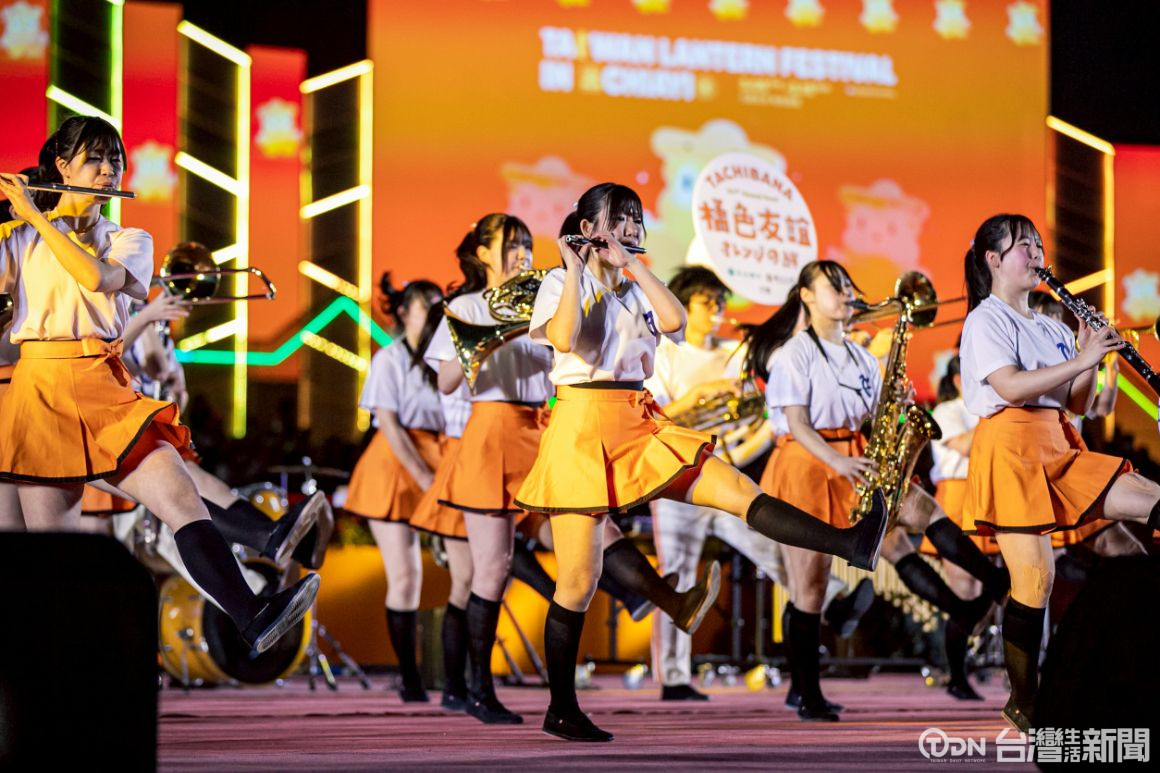 日本京都橘高校吹奏樂部121期校友樂團,日前登上燈會主舞台演出,吸引大批民眾提前到場卡位,現場氣氛相當熱烈。樂隊帶來多首精彩曲目,從經典遊戲配樂到行進樂,搭配充滿活力的舞步,展現兼具視覺與聽覺的演出,讓現場觀眾沉浸在熱烈氛圍中。橘色惡魔121期部長熊谷表示,能與三年一起努力的夥伴再次站上舞台非常開心,她也感謝台灣準備舞台,26名校友希望透過音樂延續台日情誼,帶給觀眾充滿笑容與感動的演出。