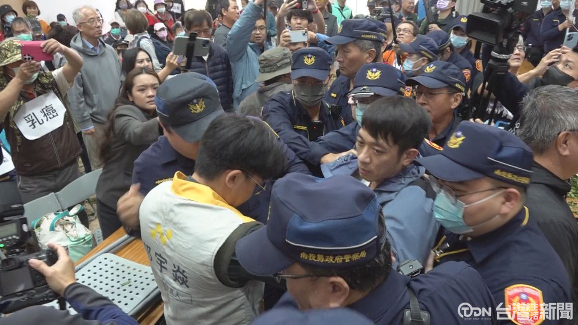 ▲警方在會場內維持秩序,並將情緒激動的抗議民眾強制帶離/記者 蔡育楷 攝