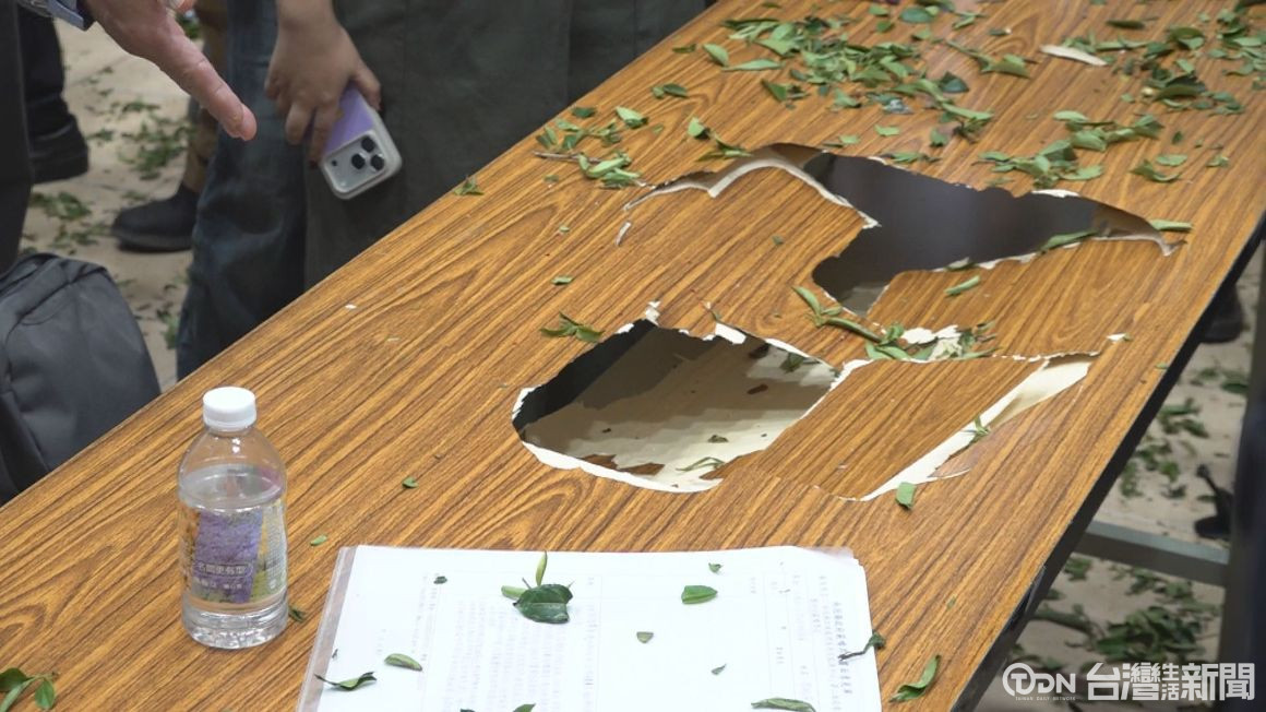 ▲會場桌面遭破壞,現場散落茶葉,顯示衝突過程相當激烈/記者 蔡育楷 攝