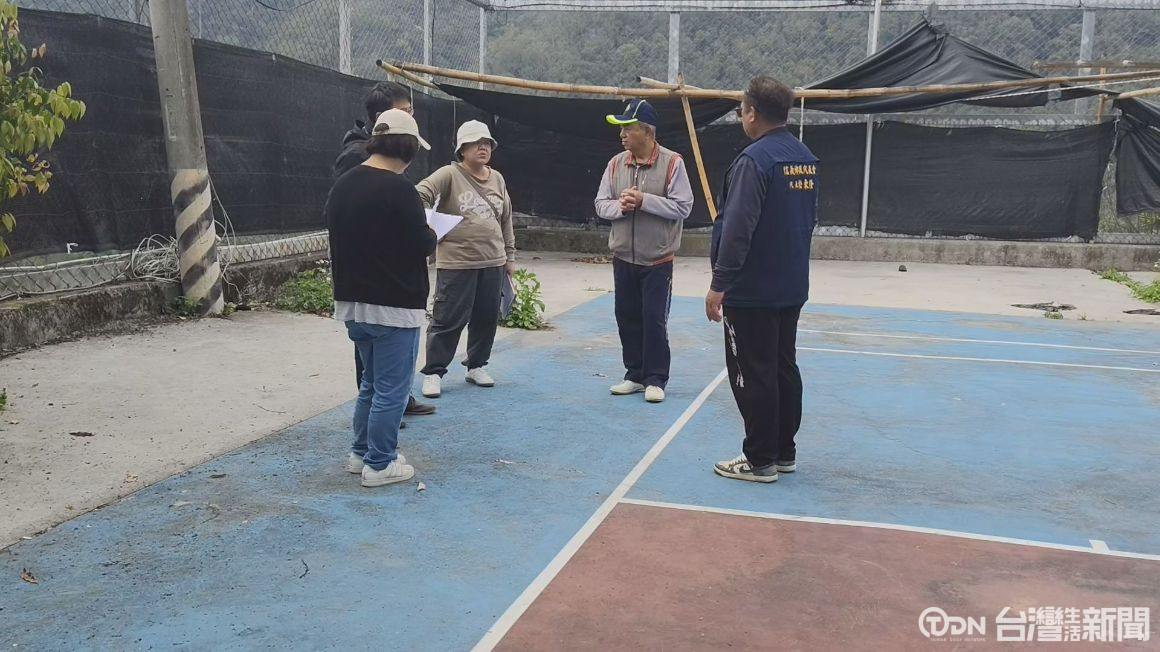 信義鄉潭南村長松照天會同信義鄉民代表松東隆,帶著縣府原民處的測設人員,來到位在部落上方天主堂教會上面的籃球場,可以很明顯看到,球場地面因為風吹雨淋日曬,破損嚴重。