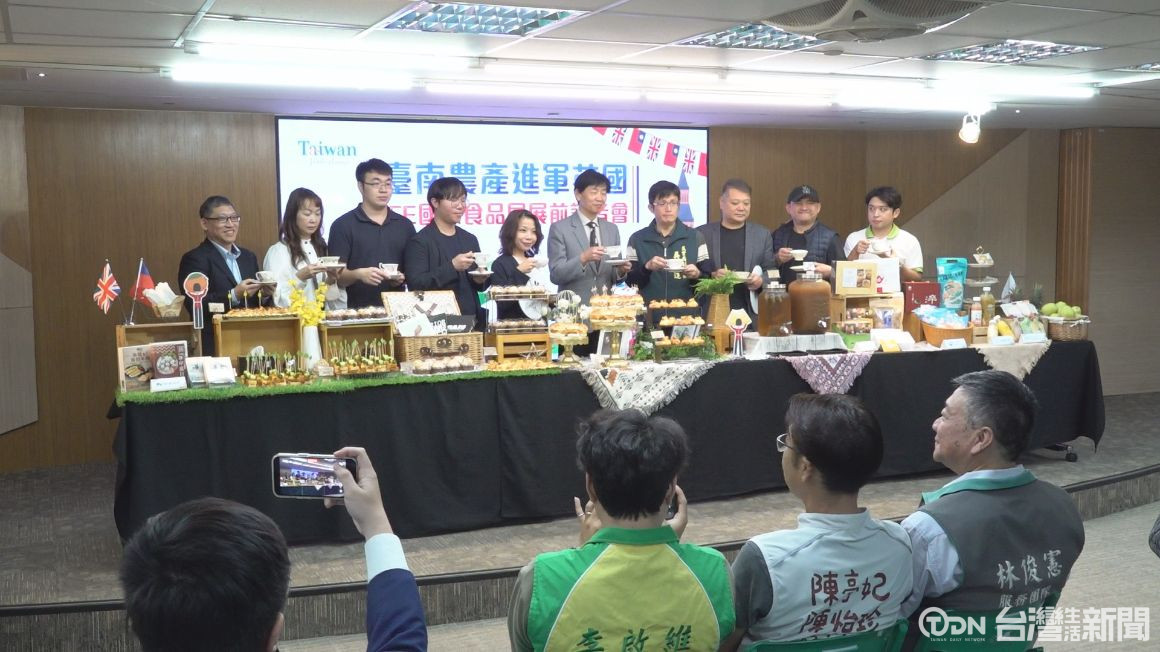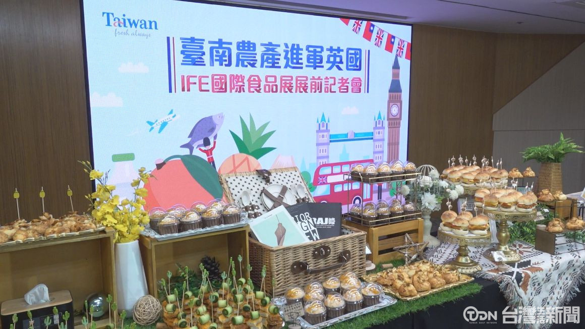桌面上擺滿臺南所出產的優質農漁產品,這是臺南市政府邀集在地廠商,首次前往英國參加國際食品飲料展,透由國際專業食品展覽平臺,行銷臺南特色農漁產品。