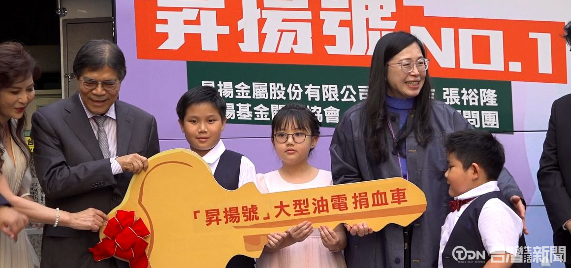 ▲小朋友手中象徵性接過車鑰匙,大家身後這台大型電動捐血車,正式捐給台灣血液基金會/記者 賴秋峰攝
