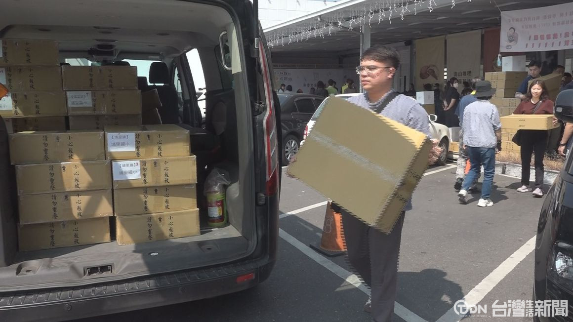 ▲學校出動多名人員及車輛,將禮物帶回學校,發送給每位學童。/記者 王昭聖 攝