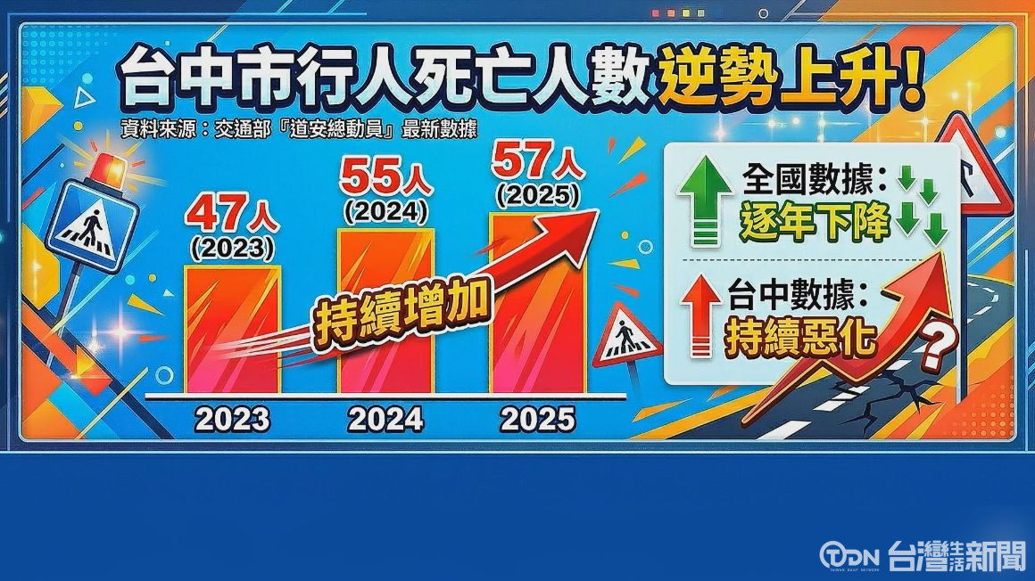 議員進一步指出,台中行人死亡人數逐年攀升,2023年為47人、2024年增加至55人,2025年更達57人,不僅未見改善,反而持續惡化。質疑市府長期以「幸福宜居城市」作為施政口號,但實際上連市民最基本的行走安全都無法保障。