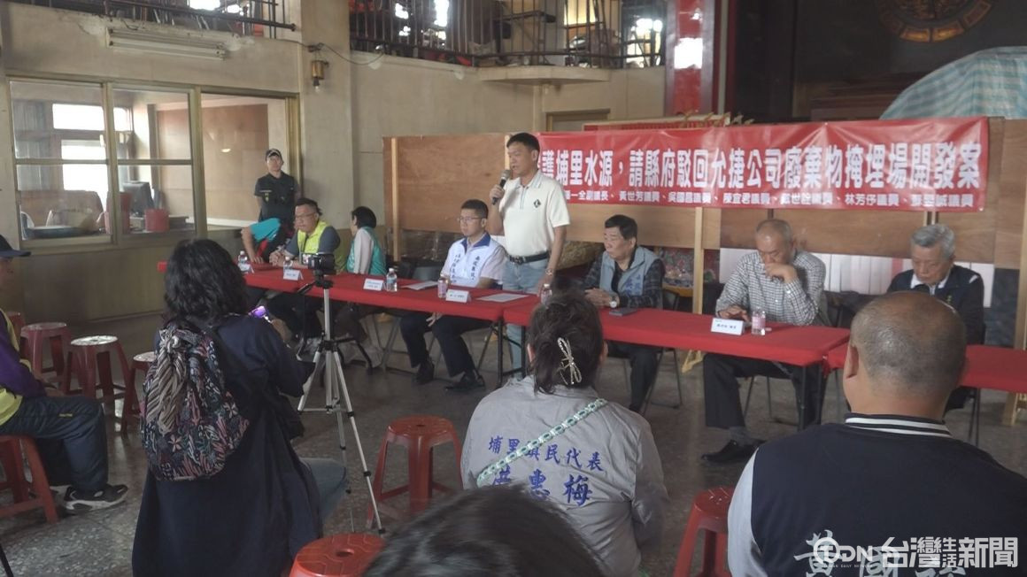 ▲南投縣議會副議長潘一全(站立者)邀集埔里鎮各界召開記者會,要求環保局駁回事業廢棄物掩埋場申設案。/記者 王昭聖 攝
