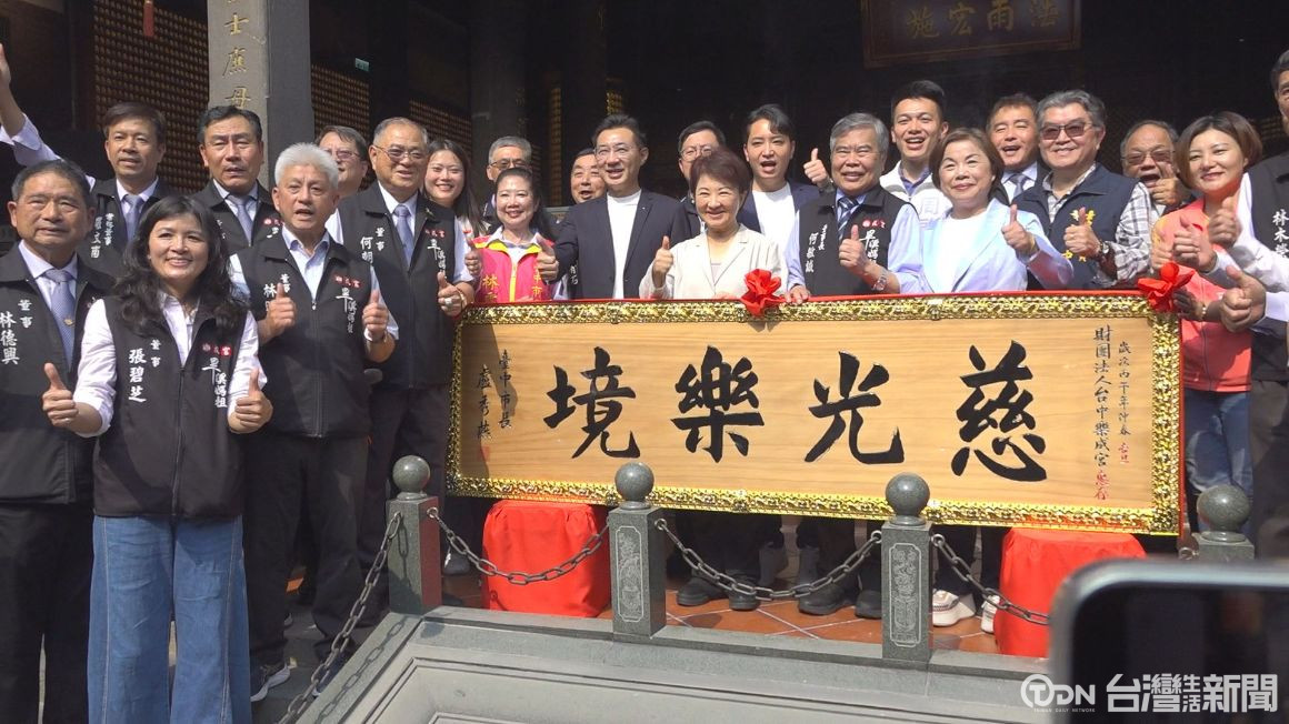 台中市長盧秀燕和樂成宮廟方人員一起上香祈福,這天,市長帶來了「慈光樂境」匾額,感謝廟方長年深耕地方,其中「慈光」象徵媽祖慈悲為懷的精神,關懷社會。