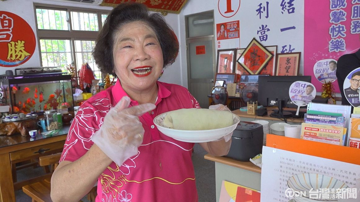 在廚房準備豐富的乾濕餡料,喜愛料理的台中市議員林碧秀要來大展廚藝,依序加入高麗菜、豆芽菜、香菜、花生粉等餡料,季節限定潤餅,完成上桌,要來慰勞服務處同仁。