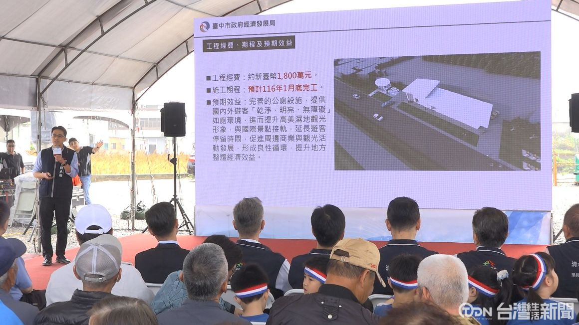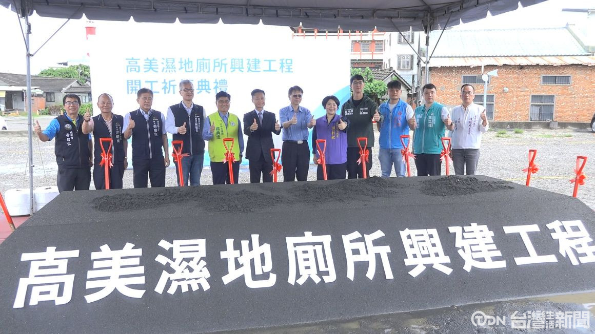 手持金鏟、開工動土,象徵工程正式啟動,台中市政府為改善高美濕地長年缺乏公廁問題,成功爭取到國產署撥出閒置用地,規劃投入1800萬元,在美堤街旁打造智慧陽光公廁及室外洗腳池,其中男女廁間比將達到1:5,以滿足使用者需求。
