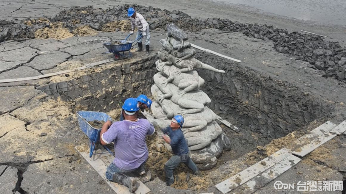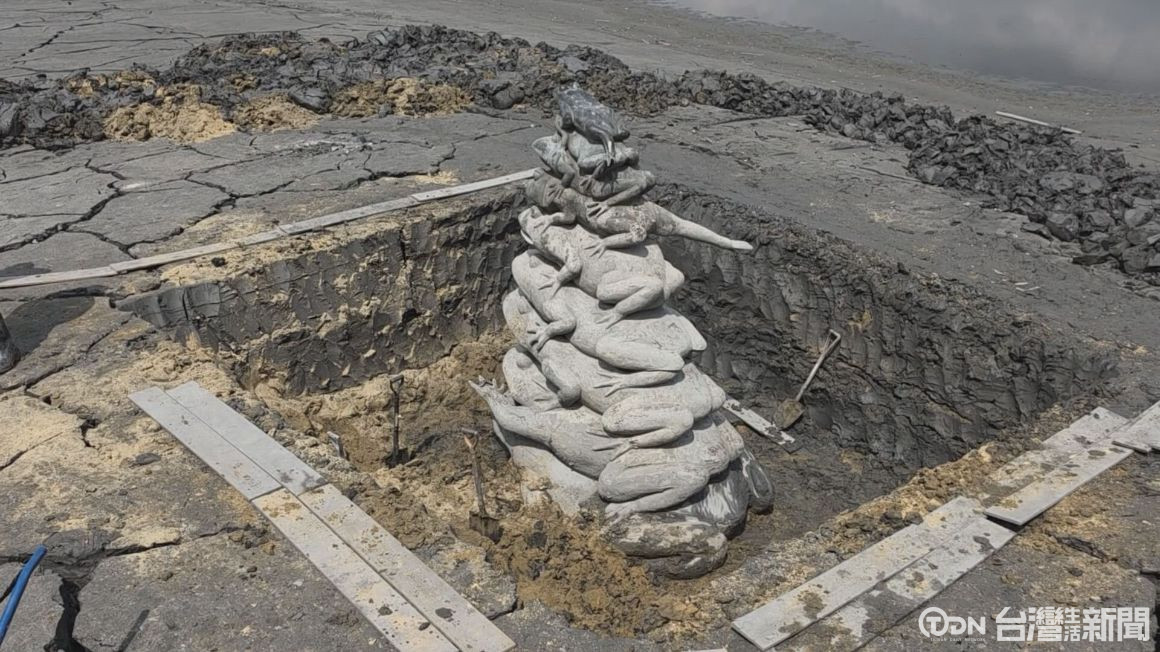▲台電派人進行清理積土,讓九蛙全部現身,距離上一次已經是五年前/記者 范宏坤 攝