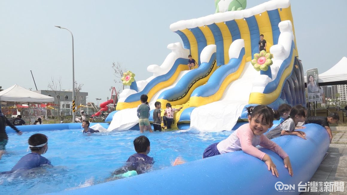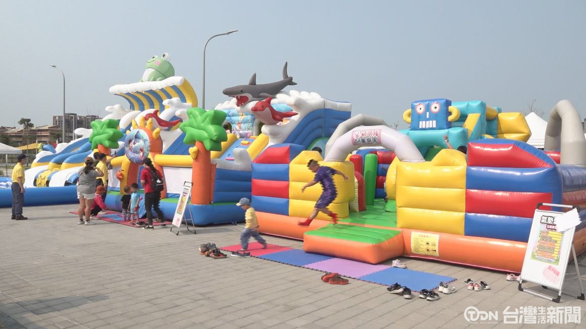時間一到,很多小朋友都搶著進入大型氣墊區內遊玩,這是安南區在地從事藝術玻璃企業,連續3年舉辦台江童樂會活動, 現場規劃多座大型氣墊城堡跟氣墊水池,不少家長帶著小朋友來遊玩。