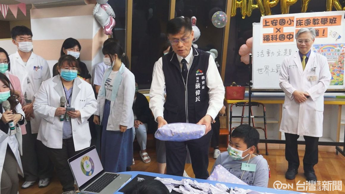 局長與院長分別送上禮物,為孩子們歡慶兒童節的到來,關懷住院學童並陪伴提前過節,台中市政府教育局長特別前往台中榮民總醫院,舉辦繪本導讀與創意壽司DIY活動,讓孩子在病房中也能享有學習與創作的樂趣。