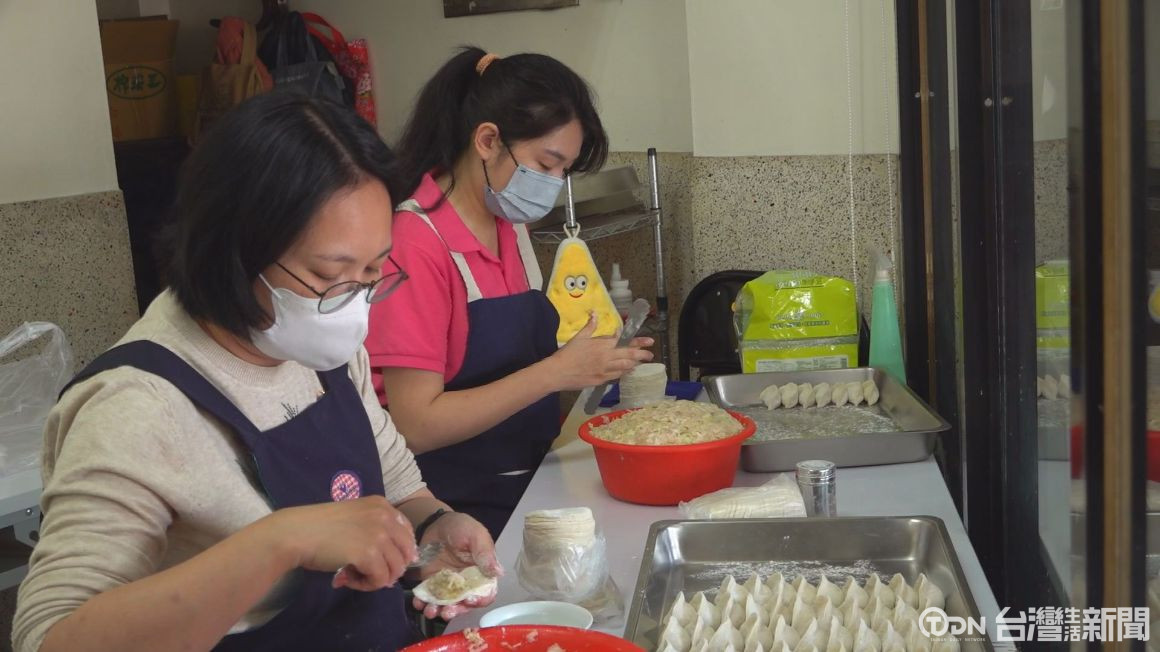 ▲賴綵畇(粉色衣服)坦言,雖然小時候常全家一起包水餃,但在家做跟開店包畢竟不同,因此創業後,跟哥哥一起,向媽媽重新學習 / 記者 王可萱 攝